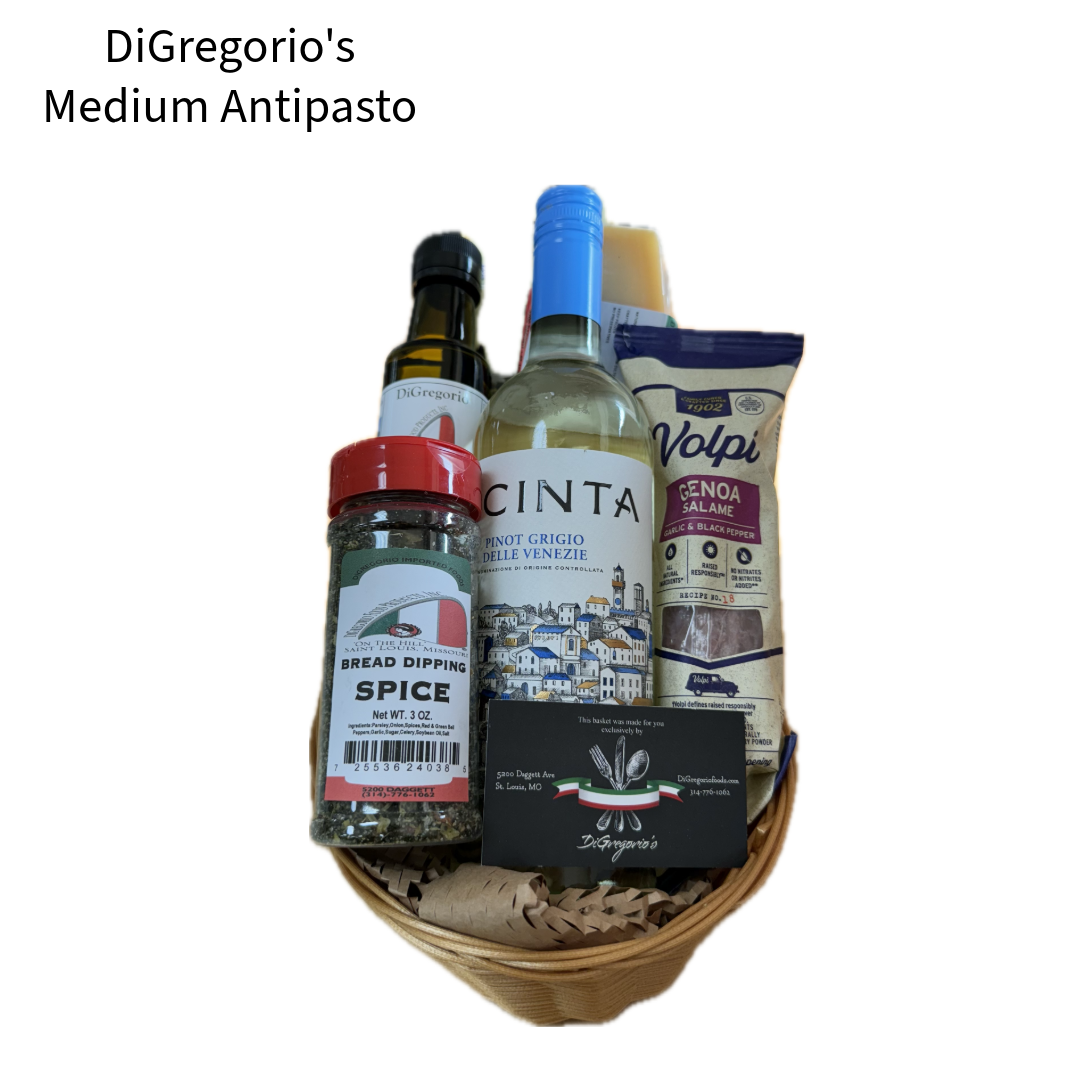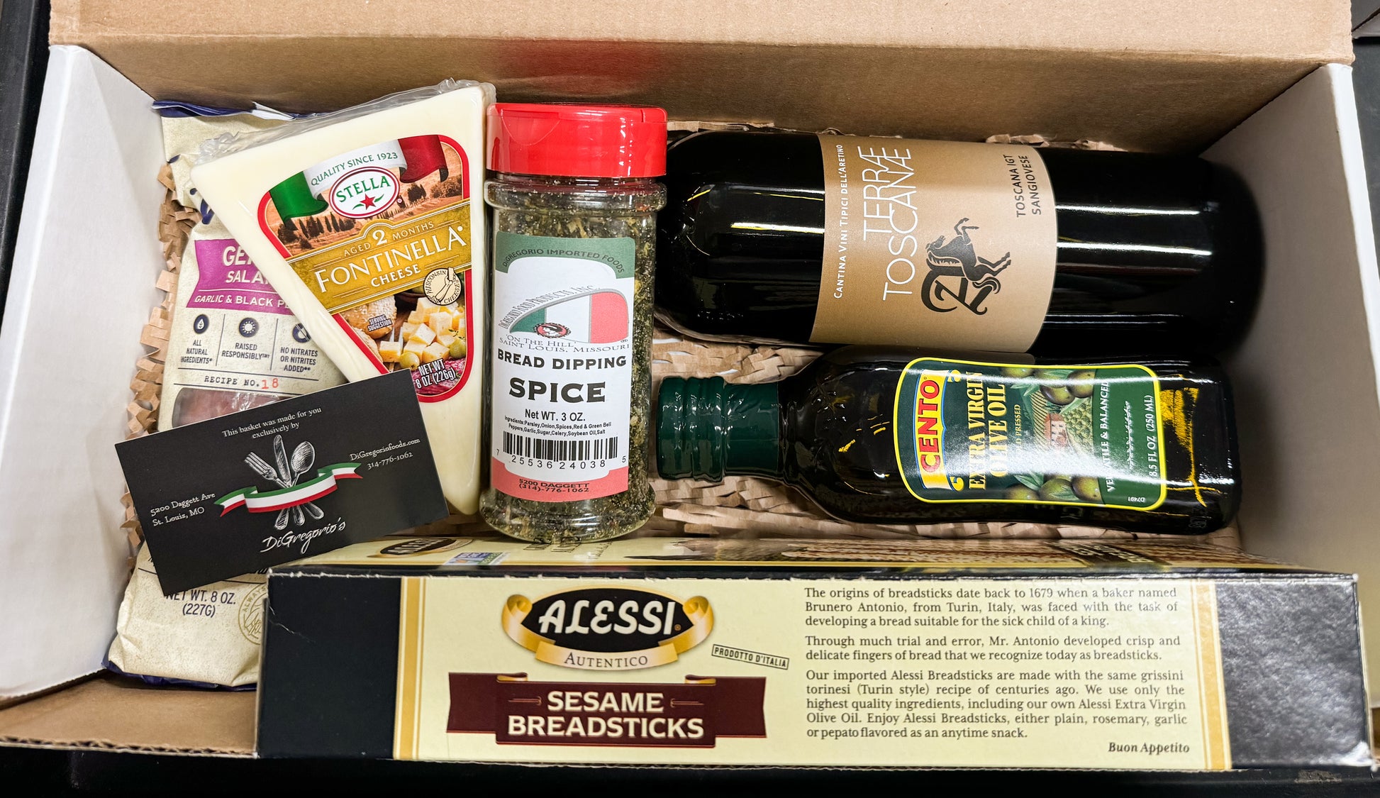 Contents: Bottle of Vino, Breadsticks, Volpi Salame Chub, Extra Virgin Olive Oil, DiGregorio's Bread Dipping Spice, Cheese Wedge.