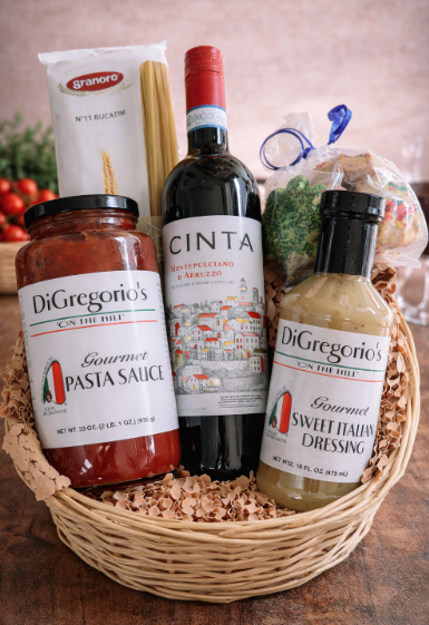 Contents: Bottle of Wine, 1 Pasta, DiGregorio's Pasta Sauce, DiGregorio's Italian Dressing, Assorted Italian Cookies.
